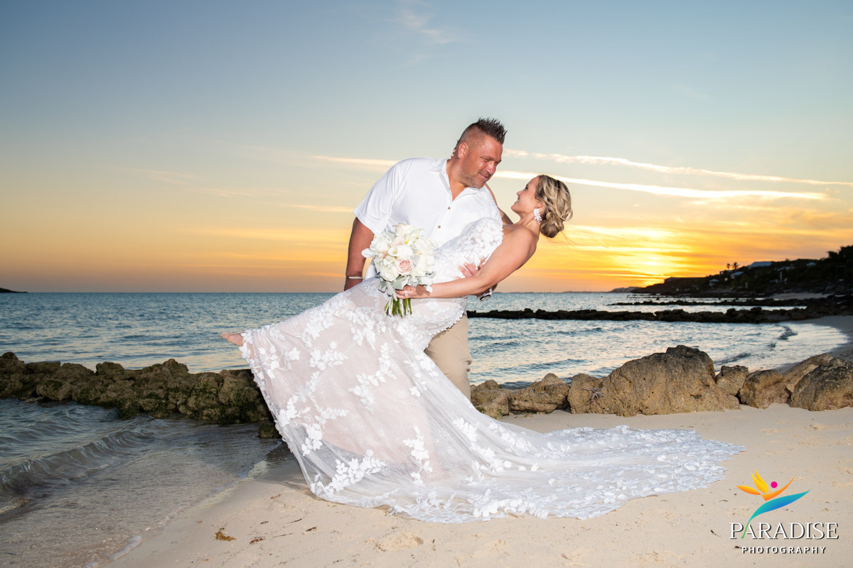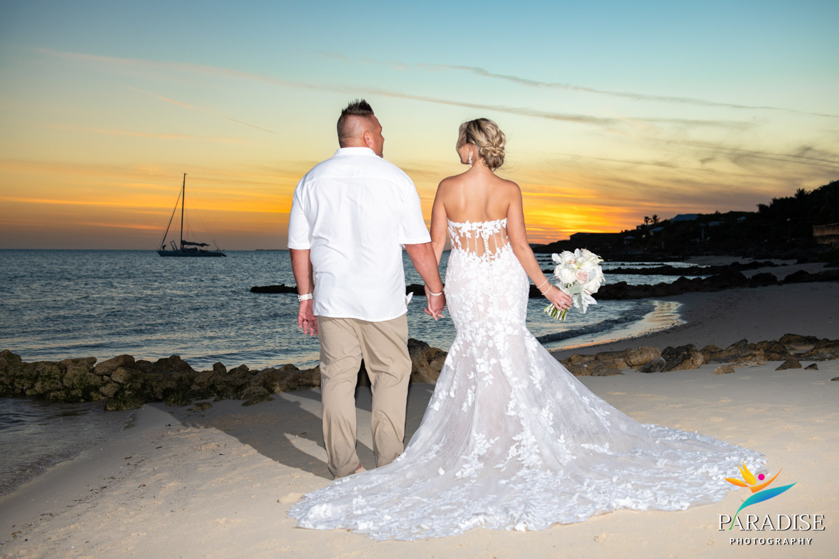 The sun disappears quickly below the horizon in Turks and Caicos, so it wasn’t long before we whisked them back to the beach. As the sun began its descent, painting the sky with those quintessential orange, pink, and purple hues that we are so famous for, we made the most of this perfect light for romantic couple photos. It was the perfect way to conclude this part of the wedding day, ensuring they had images that truly reflected the magic of their evening.