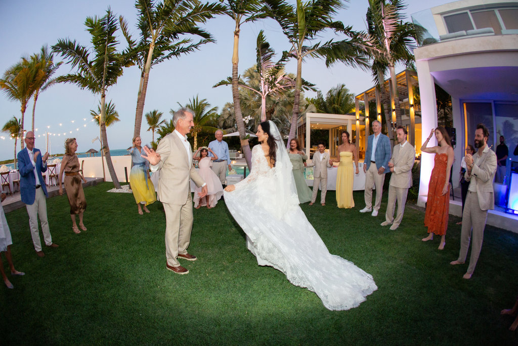 As the sun dipped below the horizon, the couple made their grand entrance onto the villa’s grassy lawn, swaying to their first dance under a blanket of Caribbean sky. Their guests soon joined them, and the evening unfolded like a dream.