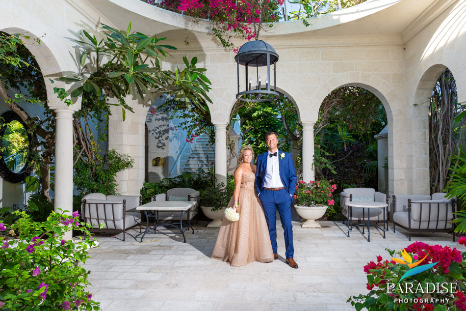 Mandy spent lots of time trying on white wedding dresses, but none of them seem to fit her personality. Then shopping one afternoon with her mom at Bergdorf Goodmans she finally found the perfect dress! Rose glitter polka dots! What a distinct and festive way to say “I do”! Let’s not forget her handsome hubby…He wore a perfectly tailored dark blue suit that matched her dress so well. We as Turks and Caicos wedding photographers were so fortunate to have the time to take them all over The Palms Resort for photos! Starting with their first look under the birdcage, then to the “secret garden,” and finally around the spa and on the beach. Their wedding ceremony was held on the beach right before sunset which helped give Mandy even more of a golden glow. Shenique from Sheque Perfection did Mandy and her mother’s hair and makeup. Mandy wanted a touch of her favorite color, so the reception flowers were elegant purple and white. The drink of the night was rum punch, which also added to the light pink theme. The bride and groom danced to the beats of DJ Dayoh. And for the reception finale, there was a surprise firework display and fire dancer! What a spectacularly winsome way to end the night.