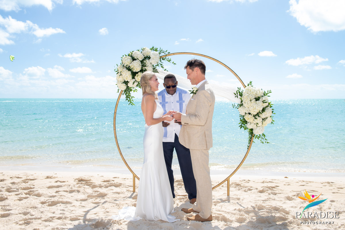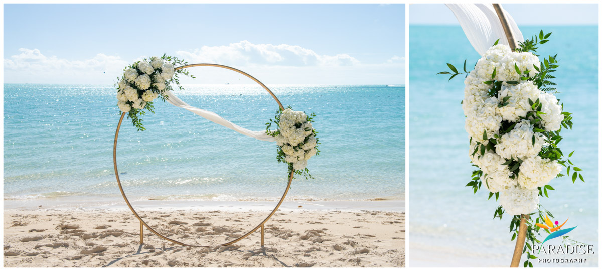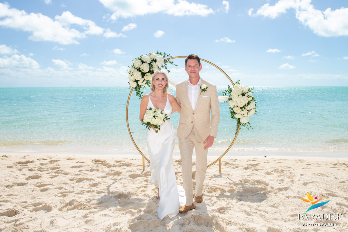 Their ceremony was beautifully minimal. It was just the two of them standing together beneath a circular gold arch decorated with white flowers and greenery. The design complemented the natural tones of the beach and ocean, creating an elegant backdrop without overwhelming the scene.